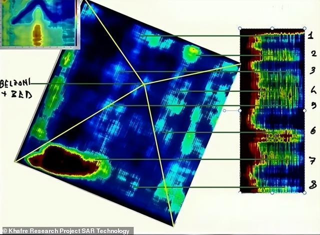 据意大利科学家主导的“哈夫拉项目”研究团队称,通过部署两颗轨道高度约为676公里的卫星,对哈夫拉金字塔区域发射雷达脉冲,并据此构建了地下三维影像模型。数据显示,在金字塔基座下方约640米深处,存在一个巨大的石灰岩平台,其中包含两个约80米见方的矩形空间,并延伸出八条直径约10至12米的圆形竖井。